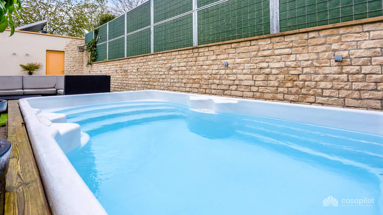 Draußen bietet das Haus eine große Terrasse wobei Sie auch den Swimmingpool und den Whirlpool finden. Auf der Terrasse befindet sich auch ein Lounge-Set.