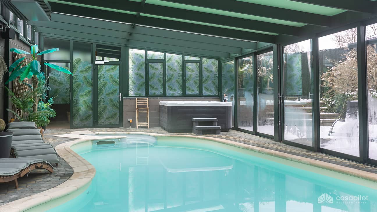 Die Unterkunft bietet viel Platz und eine offene, helle Raumaufteilung. Herzstück ist der private Wellnessbereich mit beheiztem Indoor-Pool und großen Glasflächen, die sich öffnen lassen und für ein angenehmes Raumgefühl sorgen. Zusätzlich stehen ein Whirlpool, eine finnische Sauna sowie eine Infrarot-Sauna zur Verfügung. Ein separater Raum eignet sich für Entspannung oder Yoga.
