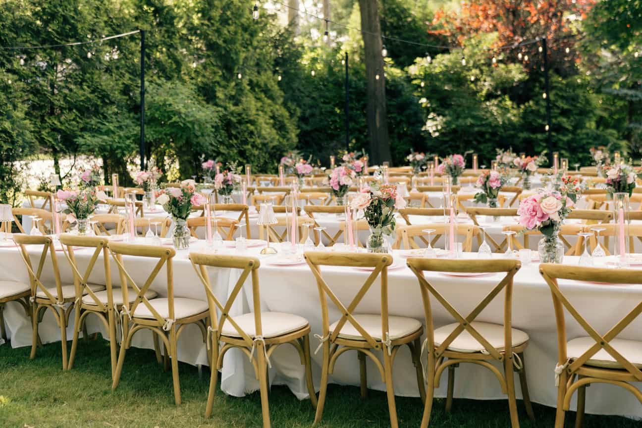Festlich gedeckte Hochzeitstafel im Freien mit Blumen und Lichterkette – Beispiel für eine Hochzeitslocation mit Übernachtung bei Casapilot