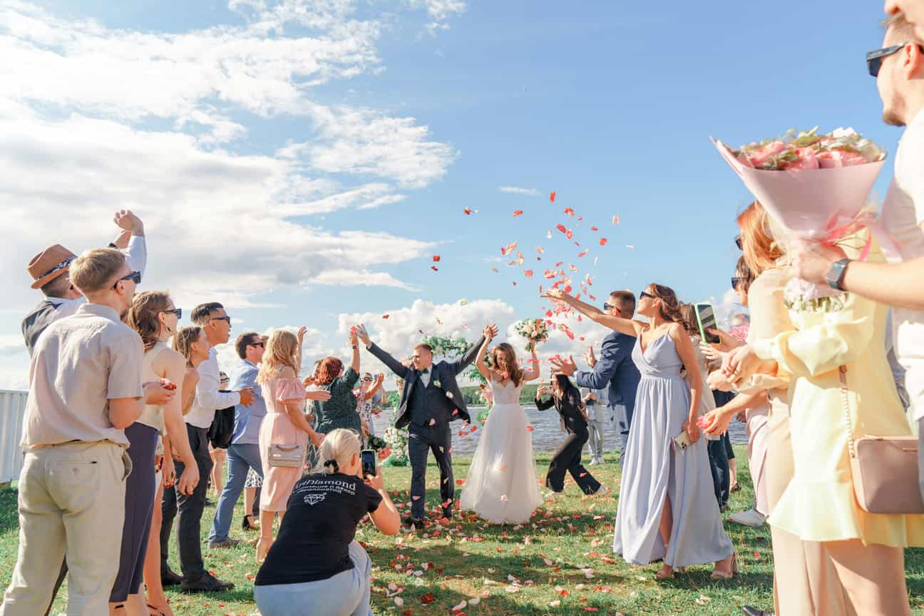 Brautpaar feiert mit Gästen im Freien – Blütenblätter fliegen, alle jubeln – perfekte Hochzeitslocation mit Übernachtung für große Gruppen bei Casapilot