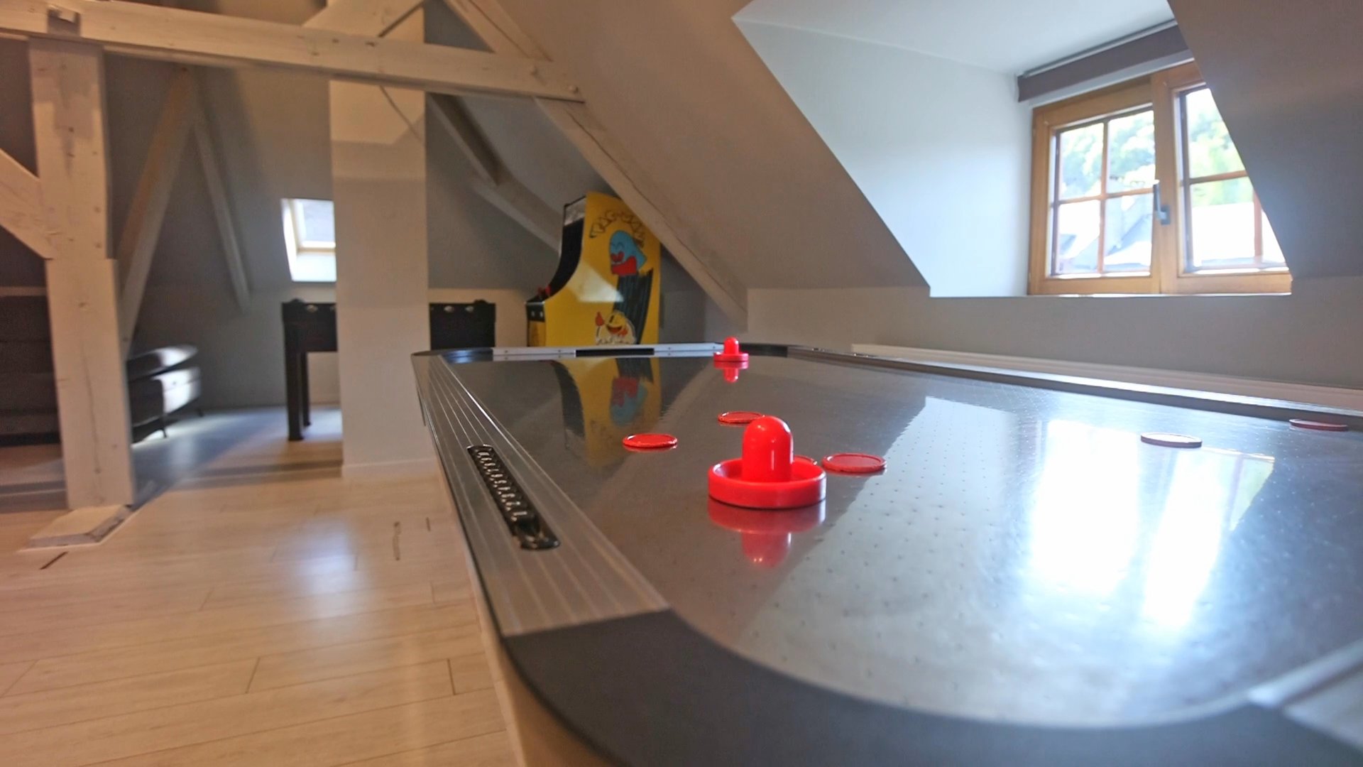 The attic has been transformed into a lovely recreation room with a pool table, air hockey, table football, an arcade machine with 60 games, and a 42-inch LED TV.