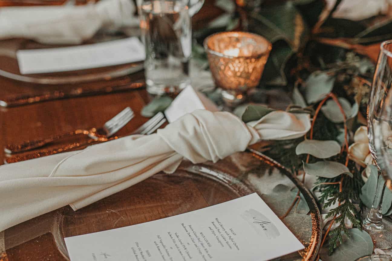 Mesa decorada para boda en una finca con alojamiento, con velas y flores naturales