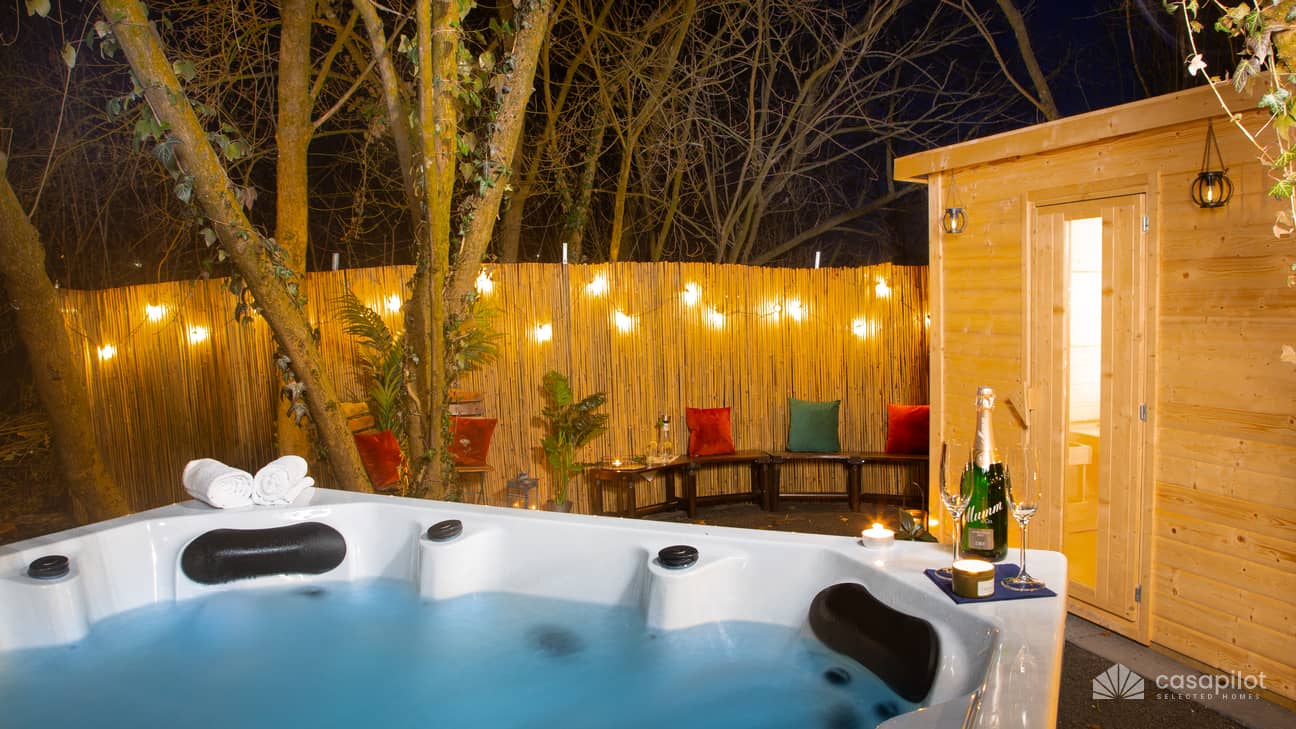 À l’extérieur, le jacuzzi et le sauna invitent à une détente totale, tandis que les deux chaises longues offrent l’endroit parfait pour profiter du soleil ou lire un bon livre. L’espace extérieur dégage une ambiance chaleureuse et constitue une extension de la maison pour des moments de repos ou de convivialité.