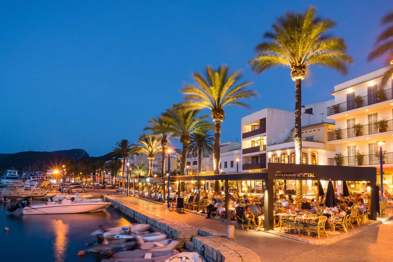 Vue du soir sur la promenade de Port d’Andratx à Majorque, avec des terrasses illuminées, des palmiers et des bateaux dans le port.