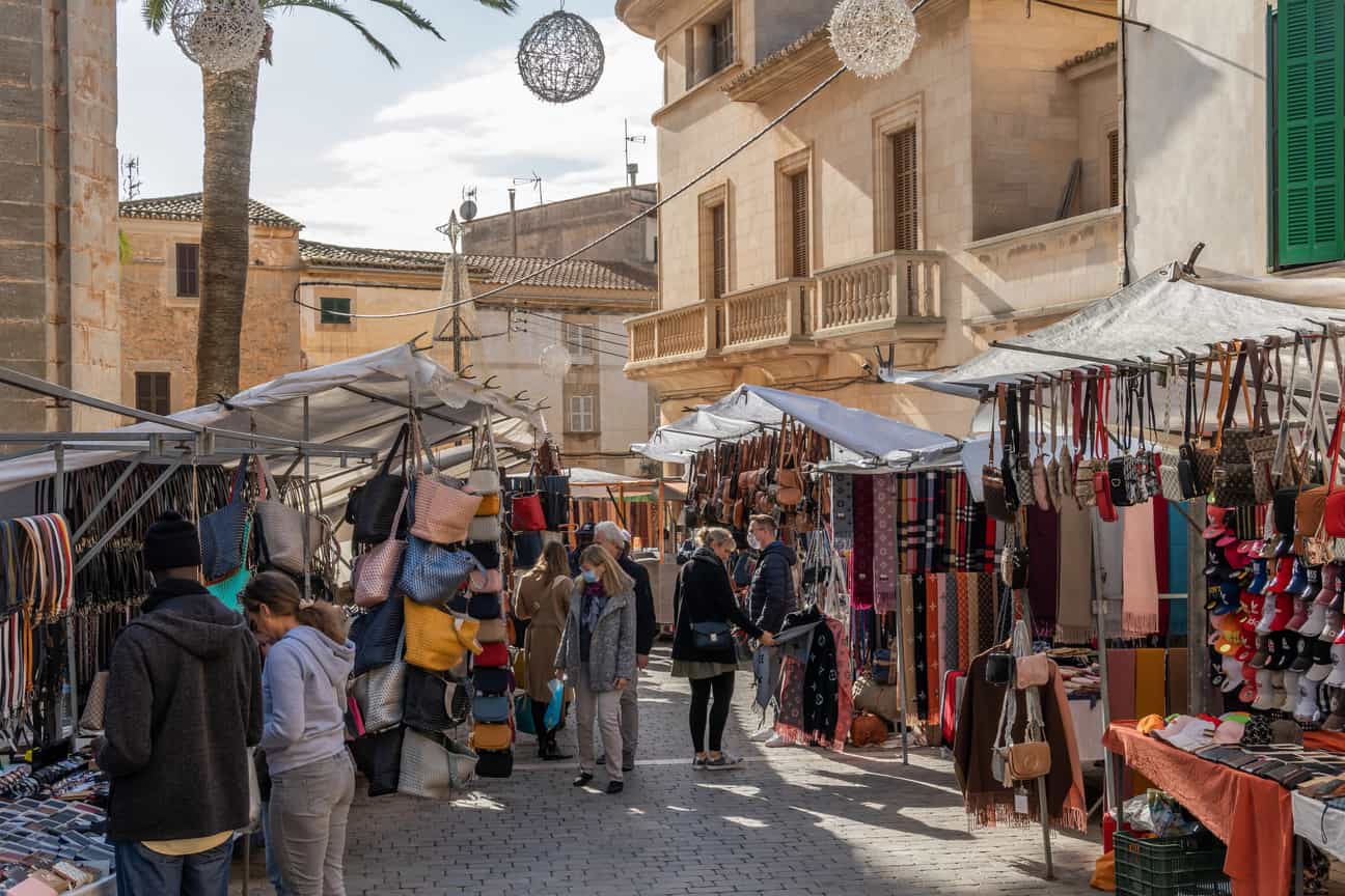 Des gens flânent sur le marché pittoresque de Santanyí à Majorque, entre les stands proposant des sacs, des écharpes et des produits locaux.