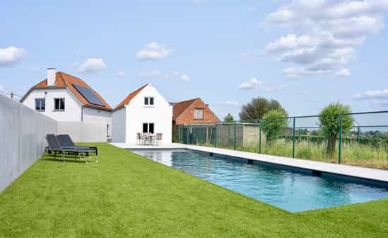 Maison de vacances moderne avec piscine intérieure, sauna infrarouge, hammam et jacuzzi dans la campagne de Flandre occidentale.