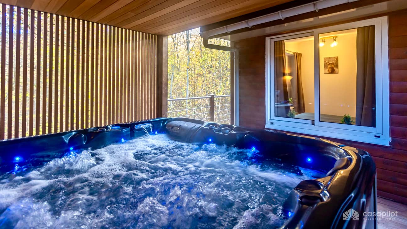 Het overdekte bubbelbad en het balkon met uitzicht op de natuur bieden een ideaal toevluchtsoord.