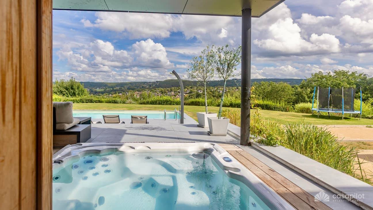 Deze moderne villa is een oase van ontspanning met een buitenzwembad en een overdekte jacuzzi en een panoramisch terras.