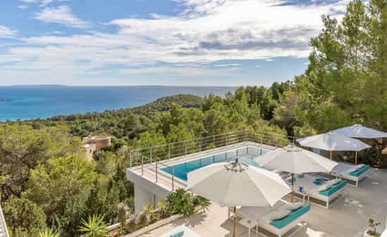 Luxe vakantiehuis op de heuvels van Ibiza, panoramisch uitzicht, buitenzwembad, modern interieur, nabij zandstrand, 6 slaapkamers met eigen badkamers